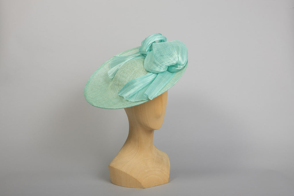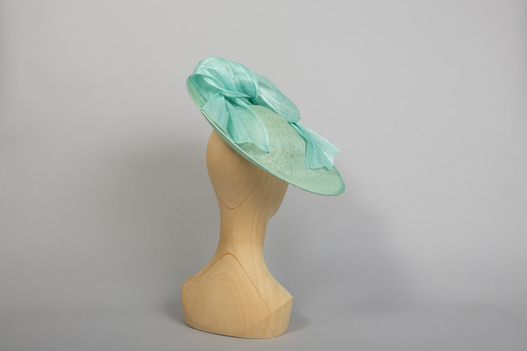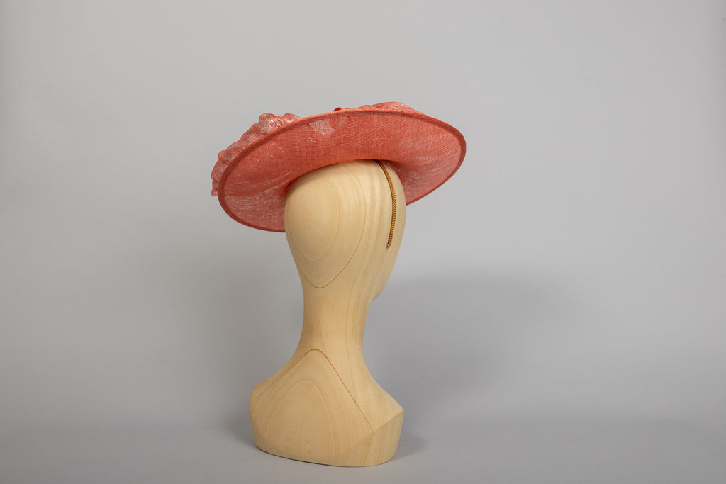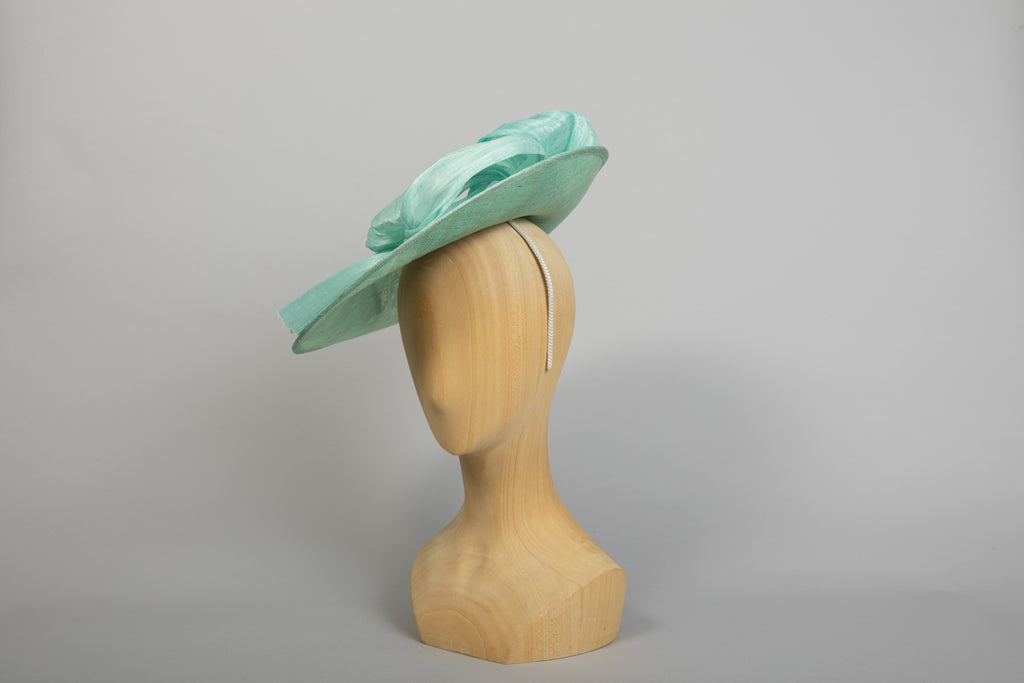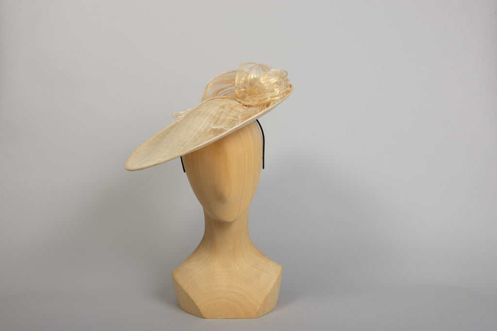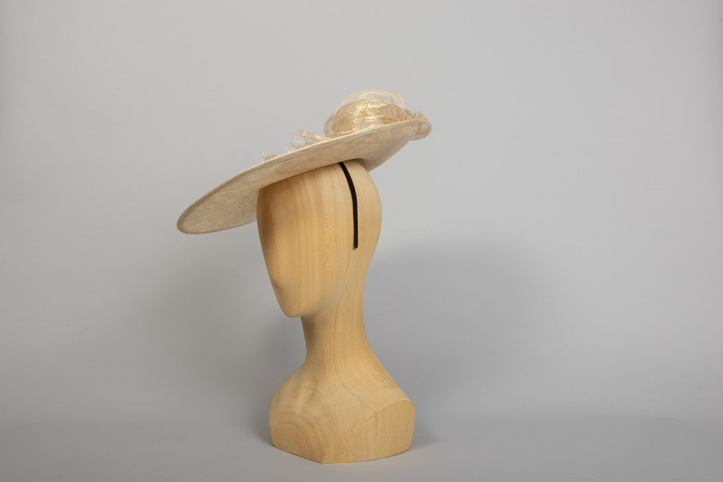 Meghan is a bibi mounted on a headband, whose sisal crown is filled with a silk abaca composition. Its elegant silhouette reveals the carriage of the head and allows you to style your hair however you like.