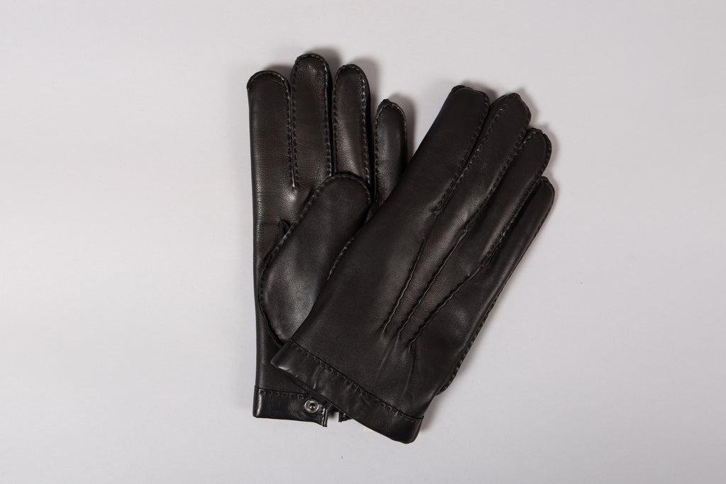 Two-material glove, with a smooth, glossy leather lining and a rabbit fur cuff. Stitching and three ribbing visible stitching for a sporty, couture finish.