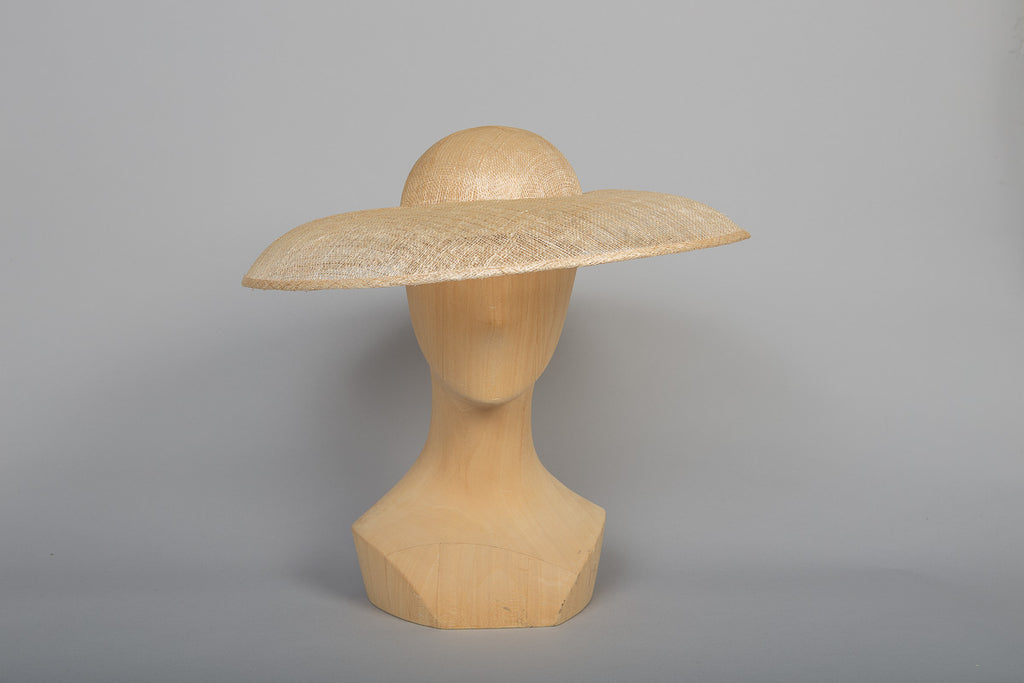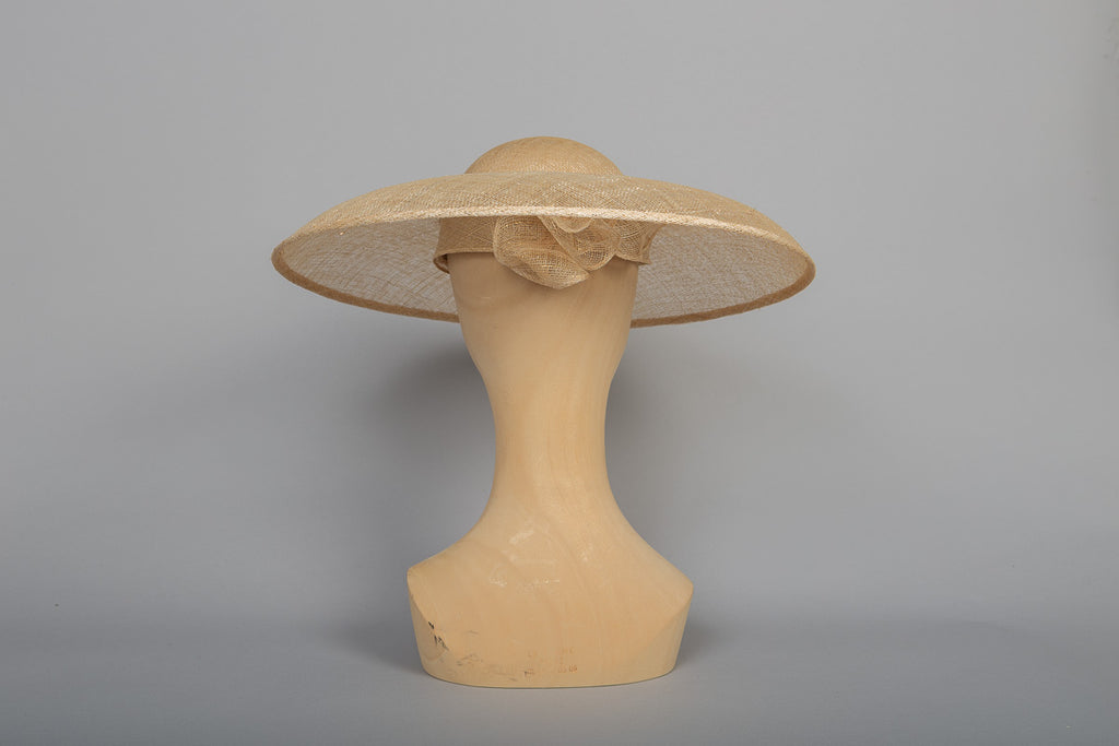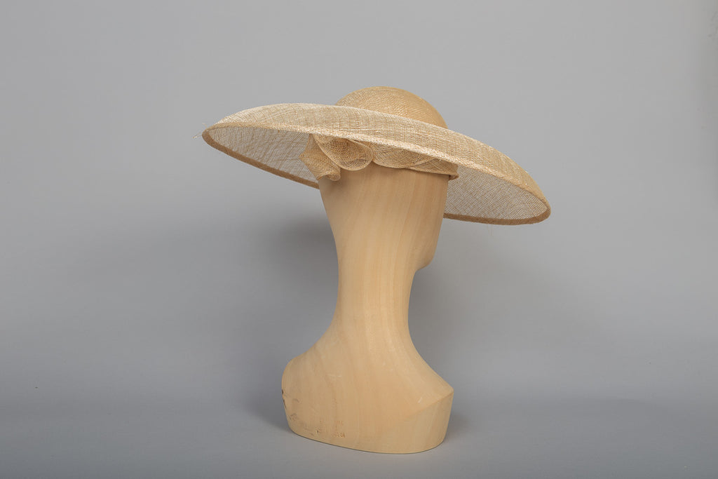 Chapeau de cérémonie en sisal glamour et orné, sous son bord asymétrique, d'une composition en sisal discrète.