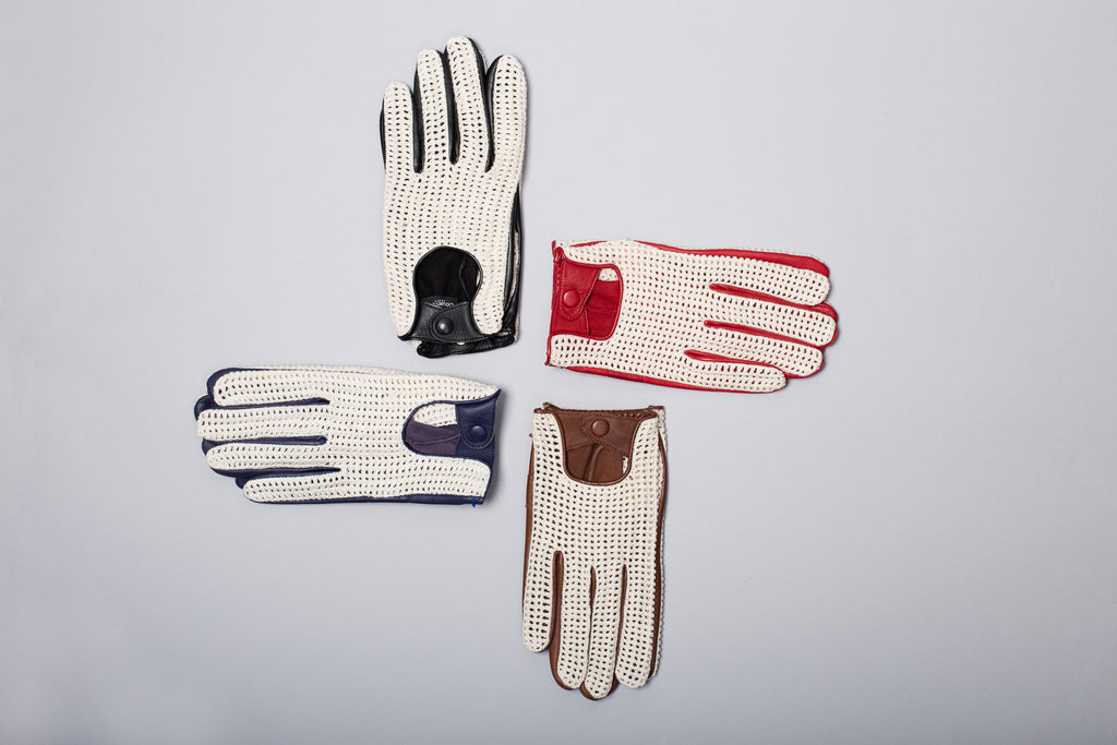 Indémodable gant de conduite décliné en plusieurs couleurs. Crochet de coton sur le dos de la main et dans la paume un cuir d’agneau non doublé très souple et agréable.