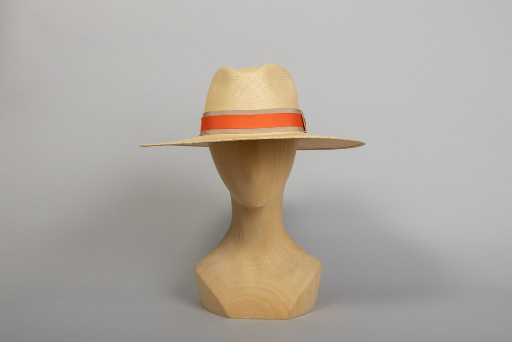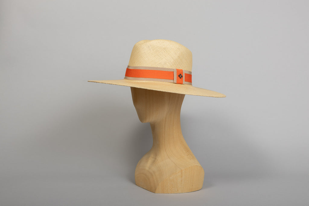 Notto est un chapeau à grand bord plat, à la calotte pincée et au détail coloré.