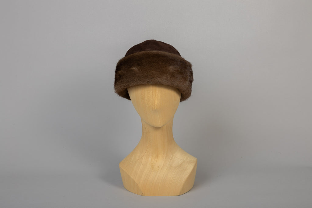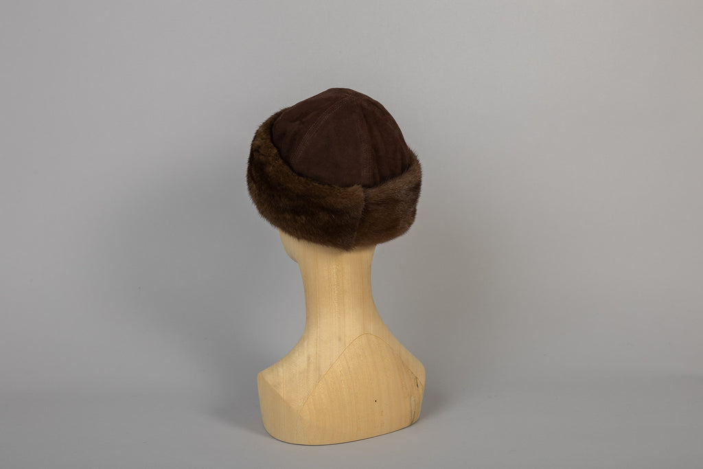 Océane est une toque en fourrure de vison dont la calotte en peau est assemblée en 4 pans sur l'envers pour laisser transparaitre des surpiqûres symétriques.