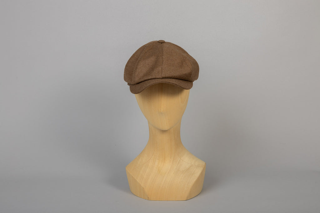 Casquette Russel style gavroche bouffante à 6 pans et petite visière courbée, en laine Loro Piana.
