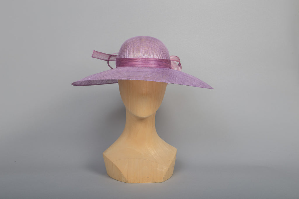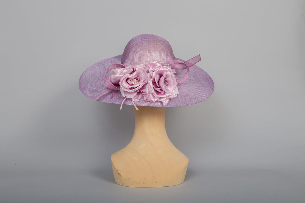 Capeline à bords très légèrement tombants et garnie d'une composition de fleurs en soie et abaca.
