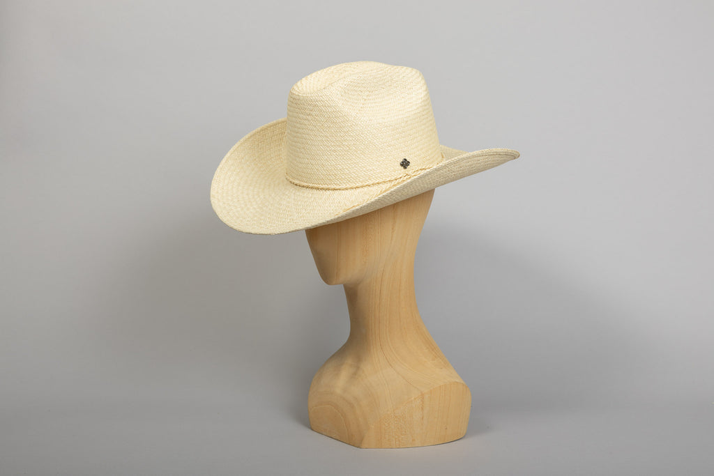 Chapeau en paille de panama, forme cowboy à la calotte haute et au bord relevé, détail brin de paille en guise de ruban.