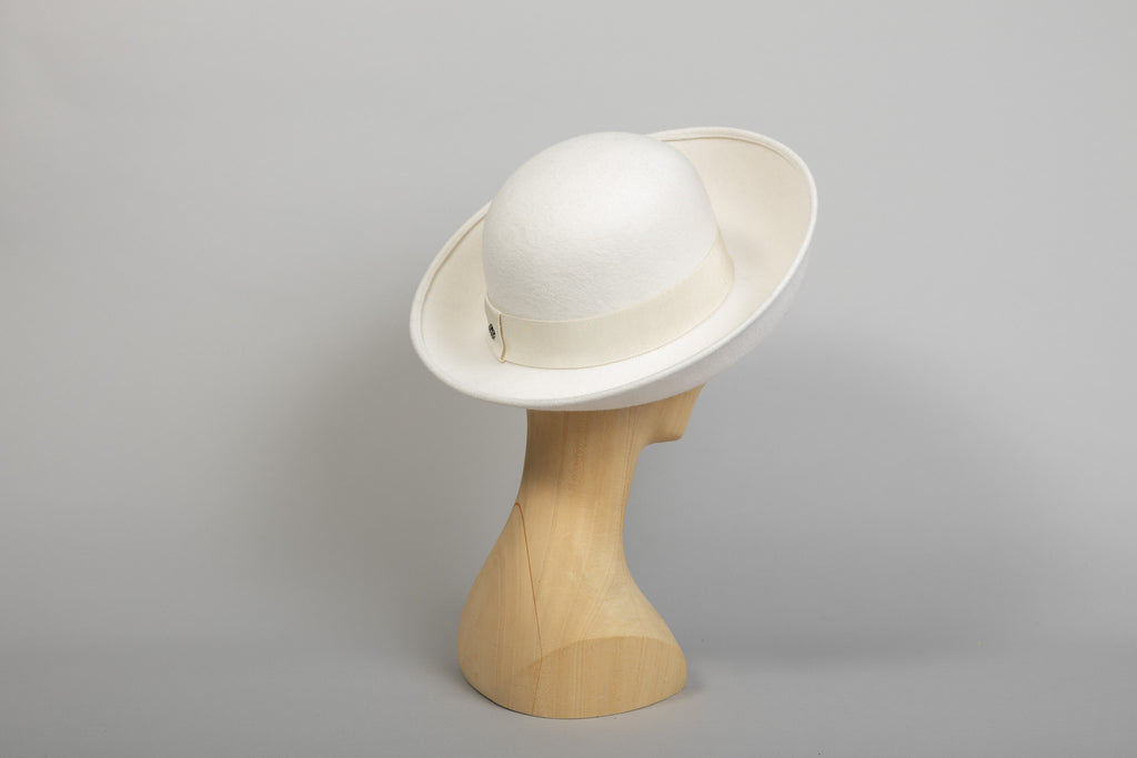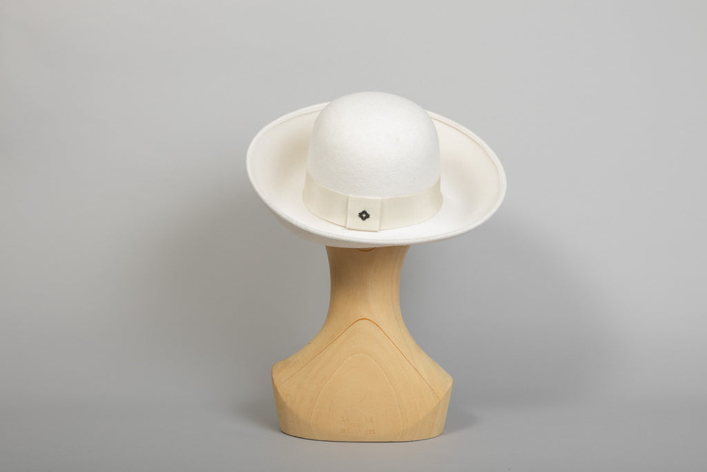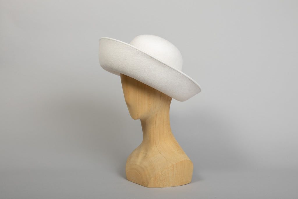 Vicky est un chapeau style 70s, à grand bord relevé sur l'avant, réalisé en feutre de poil de lapin.